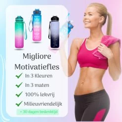 Migliore Drinkfles – Luxe Drinkfles Met Rietje – Waterfles 1 Liter – Water Bottle – Motivatie Waterfles Met Tijdmarkeringen – Ook In 600 Ml En 2 Liter
