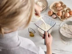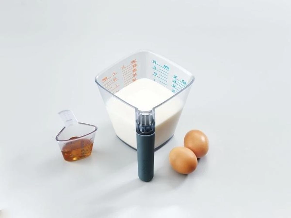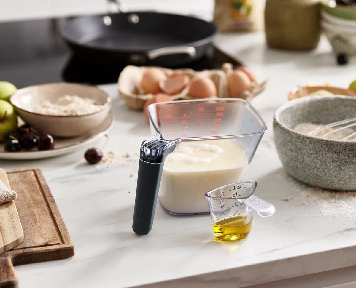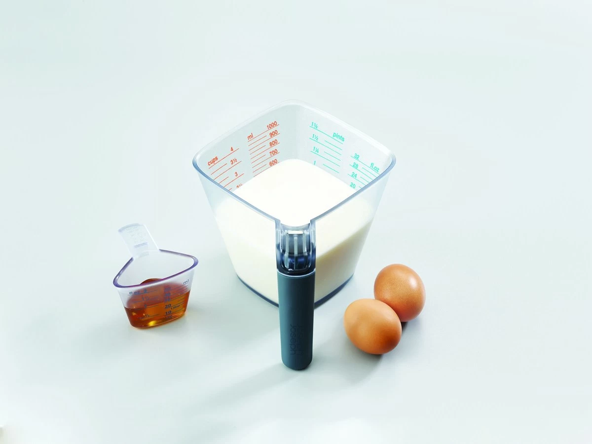 Deze 2 delige Align maatbeker set van Joseph Joseph is perfect voor het afmeten van diverse ingrediënten. De grote maatbeker heeft een inhoud van 1 liter en is door het gebogen ontwerp gemakkelijk af van bovenaf af te lezen. Aan de 2 zijkanten vind je grote tekst voor het afmeten van ml, pints, ounces en cups. De mini maatbeker heeft een inhoud van 50 ml en is perfect voor het nauwkeurig afmeten van de kleine hoeveelheden. De 2 maatbekers kunnen in elkaar worden opgeborgen voor ruimtebesparing. Na gebruiken kunnen beide maatbekers worden schoongemaakt in de vaatwasser.
