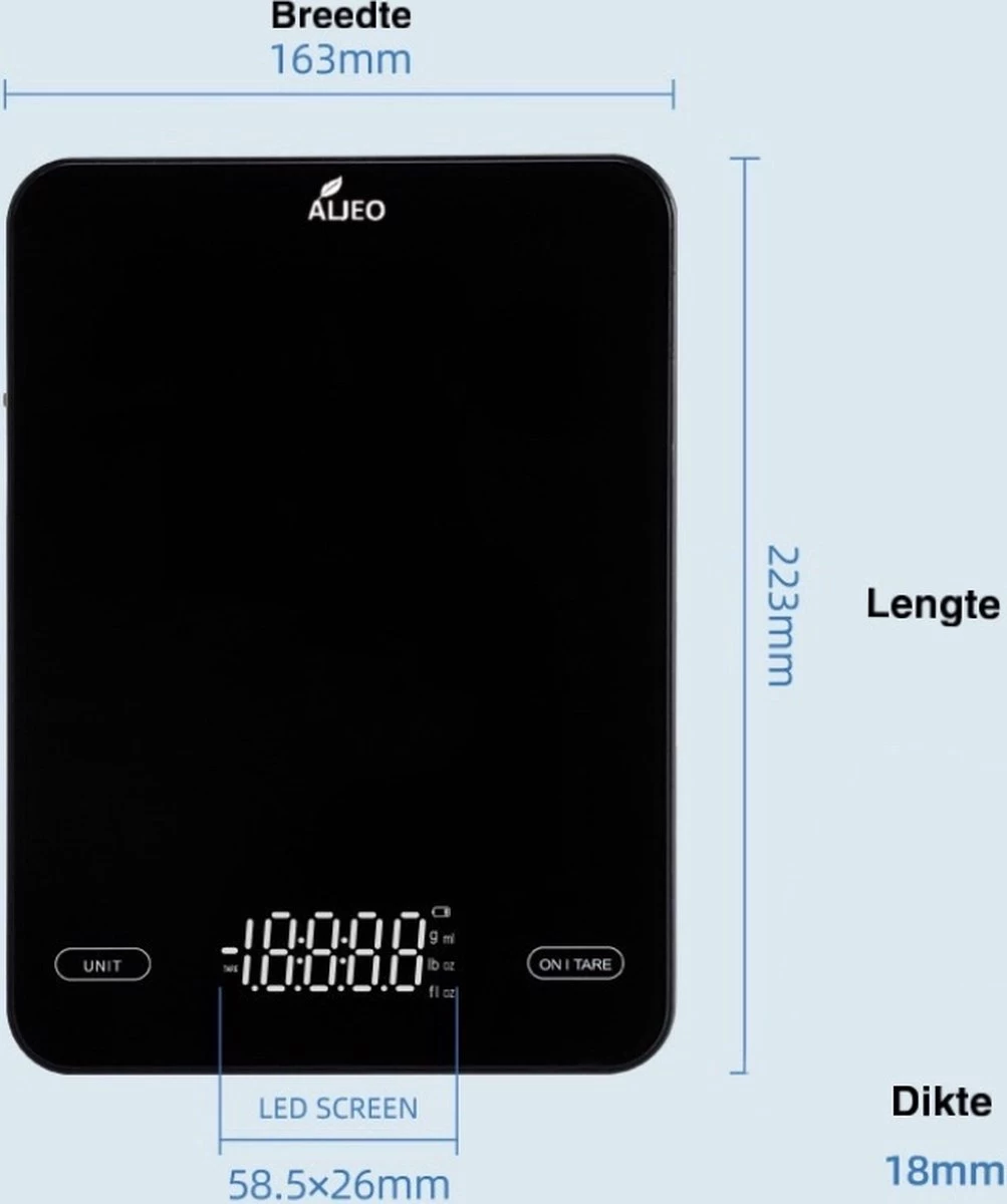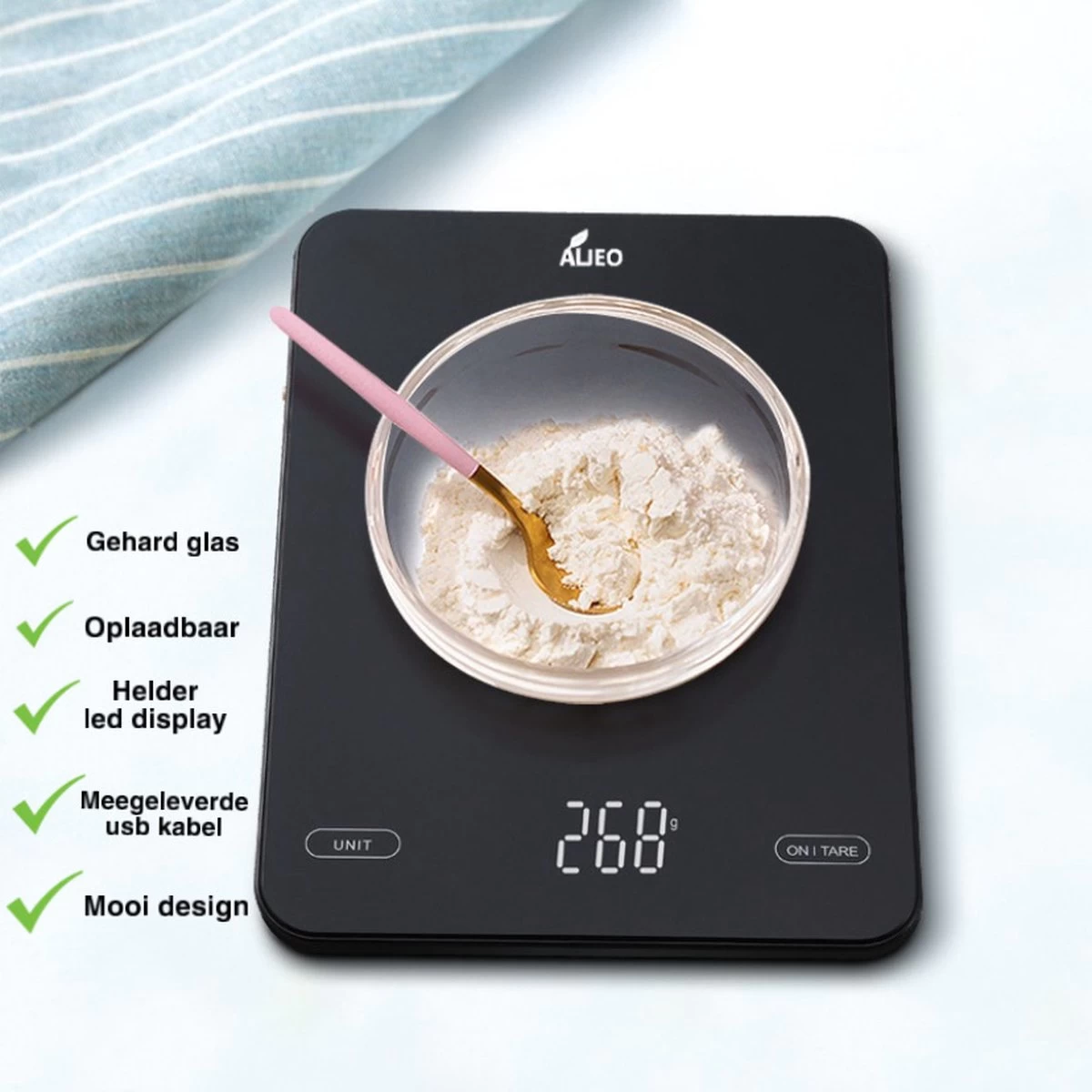 De weegschaal heeft een een ingebouwde oplaadbare lithiumbatterij. Deze ALJEO digitale precisie keukenweegschaal meet nauwkeurig en precies tot 10kg (min. 2gram- max. 10kg). De weegschaal heeft een helder display en het weegoppervlak is voorzien van sterk gehard glas, hierdoor is het makkelijk schoon te maken en is het weegoppervlak waterproof. De weegschaal is ook voorzien van een modern touchscreen. De weegschaal heeft een groter weegoppervlak dan de meeste andere keukenweegschalen, dit is ideaal als je kommen en andere grotere objecten wil wegen. De weegschaal is afstelbaar naar de gewenste meetmaat. Ook is de weegschaal voorzien van een Tarra-functie, dit bespaart een hoop rekenwerk en zorgt voor veel gemak.