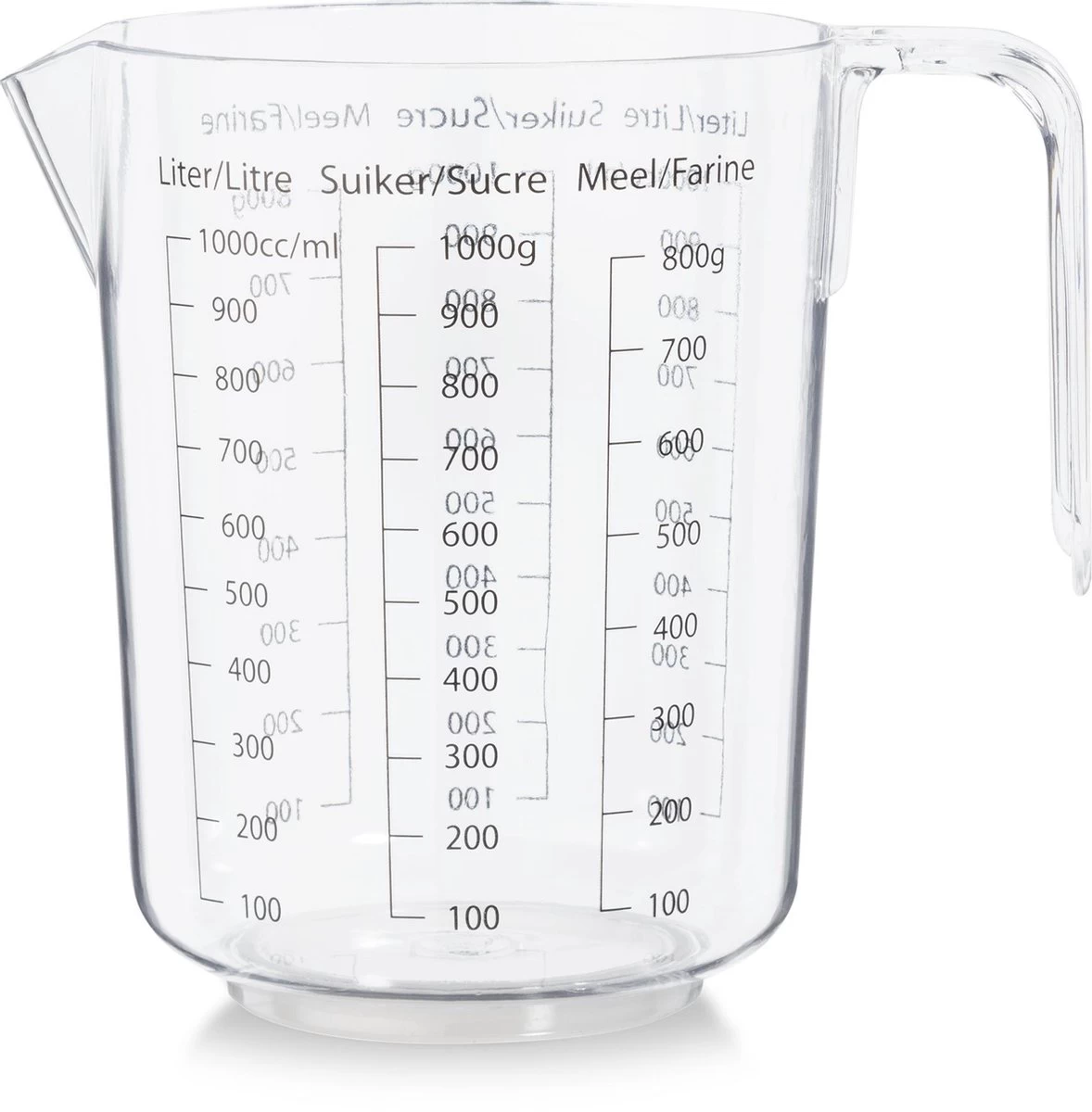 Handige maatbeker gemaakt van van stevig kunststof. Verschillende ingrediënten zijn gemakkelijk af te meten door maataanduidingen. De maatbeker meet tot 1 liter.