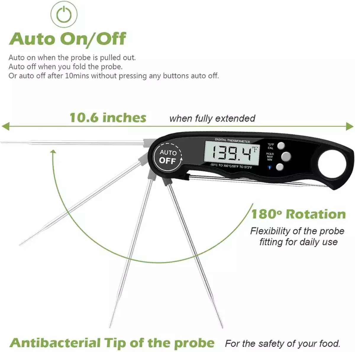 Het apparaat heeft een leesbaar LCD-display met achtergrondverlichting dat het lezen eenvoudiger maakt. Een lange, hittebestendige sonde vergemakkelijkt het plaatsen ervan in het voedsel en het meten van de temperatuur van bijvoorbeeld vlees.