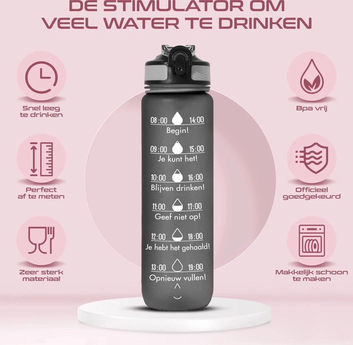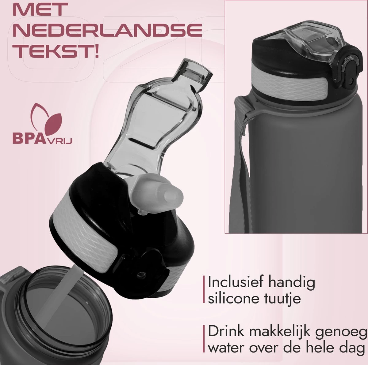 Gluxury Luxe Motivatie Waterfles – Nederlandse Tekst – Drinkfles Met Rietje – 1 Liter Drinkfles – Waterfles Met Tijdmarkering – Inc E-book – Zwart