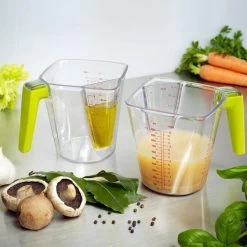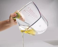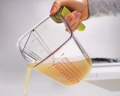 De maatbeker heeft een prettig soft-grip-handvat. Schenken gaat zonder morsen door de handige hoeken.