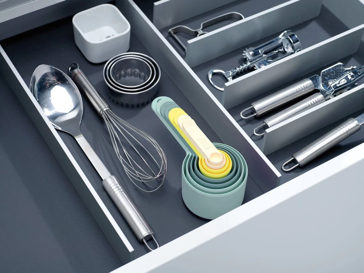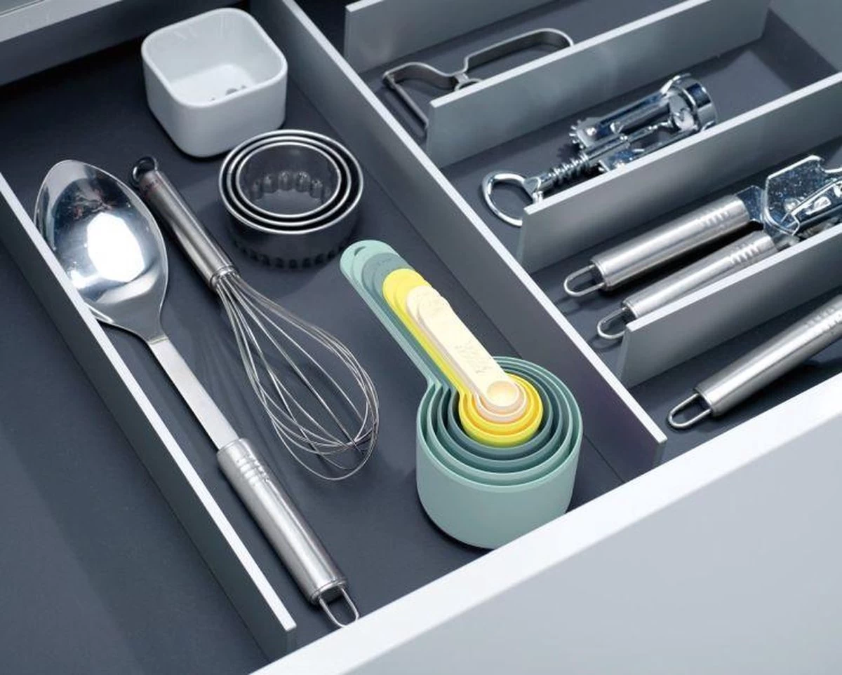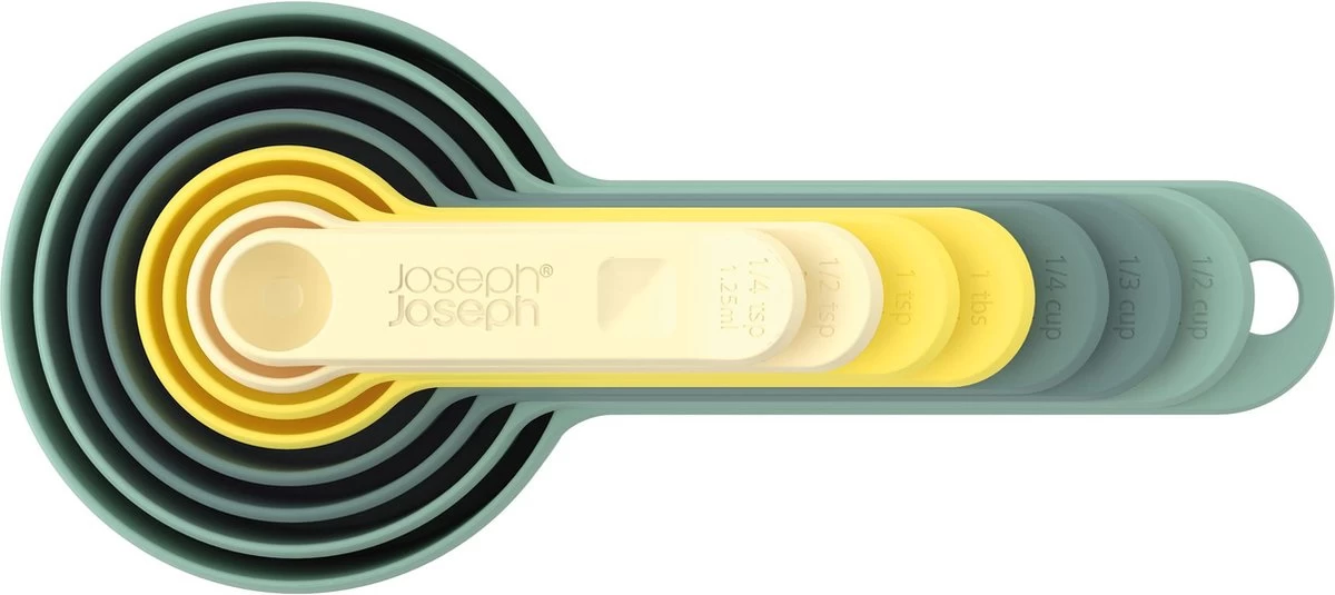 De serie Nest is de ultieme collectie van praktische keukenhulpjes. De Nest artikelen passen allemaal in elkaar zodat ze ruimte besparen in de keukenla en kast. Deze set maatcupjes is ideaal voor tijdens het bakken en koken. De set bestaat uit 8 verschillende maten. In elkaar gestapeld vormt de set door de verschillende pastel kleuren een mooi geheel. Dit kleurenschema is opal genoemd. De beste sets van joseph Joseph zijn nogmaals uitgebracht in de opal kleuren.