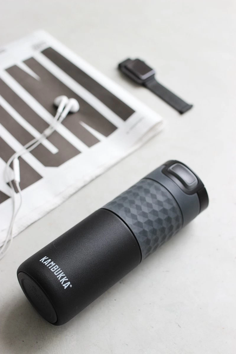 1: Druk’-positie: druk op de knop van onze thermosbeker om een slok te nemen. Nooit meer morsen terwijl je haast naar de volgende meeting of al rennend je trein probeert te halen.