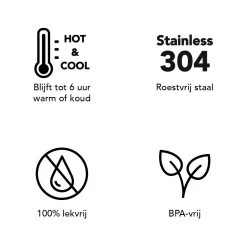De roestvrijstalen wand aan zowel de binnen- als de buitenkant en de speciale koperen coating zorgen ervoor dat eten en drinken 4 tot 6 uur warm of koud blijft.