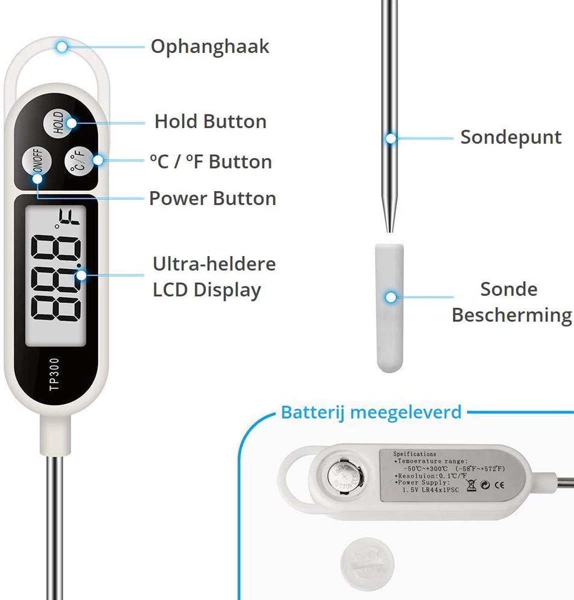 – Groot en gemakkelijk leesbare LCD display met temperatuuraanduiding in graden Celcius of Fahrenheit