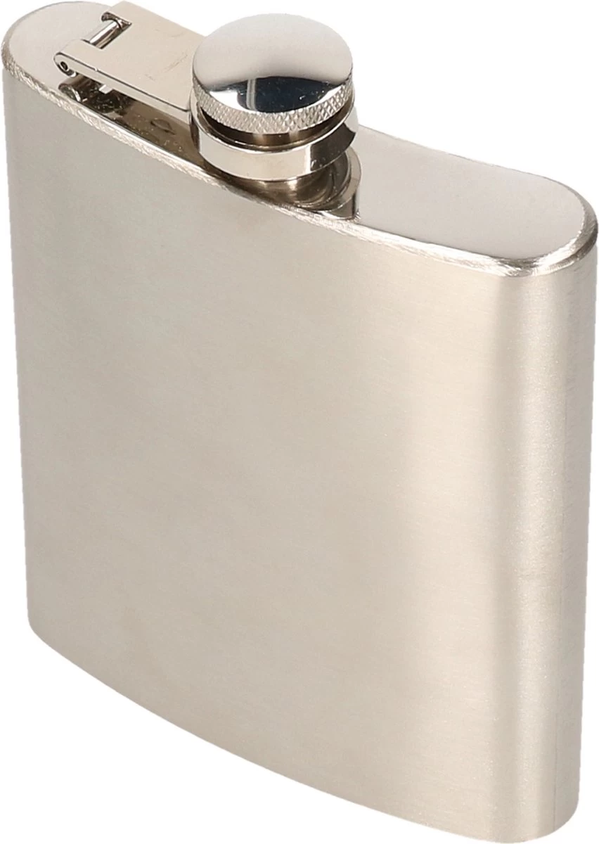 Heupfles 200 ml van RVS. Heupfles van roestvrij staal met schroefdop. De inhoud is ongeveer 200 ml. Formaat: 9 x 12 cm.