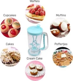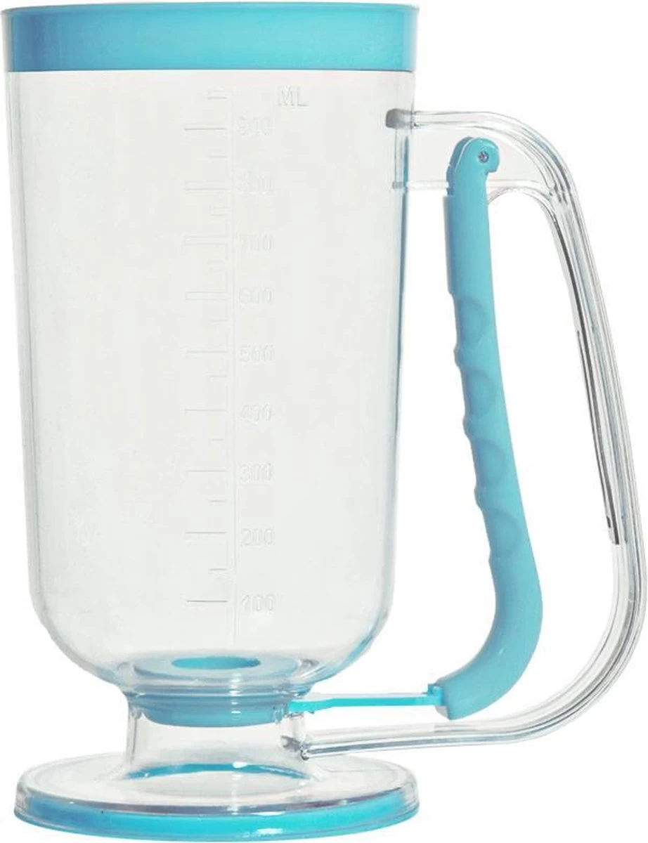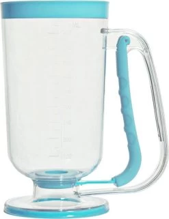 De Batter Dispenser is een uiterst handige Beslag Beker voor het maken van pannenkoeken beslag. Of zonder geknoei cupcakes, muffins of andere lekkernijen maken. De inhoud van de Beslag Beker is 900 ml. Door de brede opening is beslag eenvoudig in de Beslag Beker te gieten en is de beker ook makkelijk schoon te maken. Door middel van de hendel, kun je precies de hoeveelheid gieten die nodig is. De Beslag Beker kun je met één hand bedienen en je hebt altijd de perfecte hoeveelheid beslag!