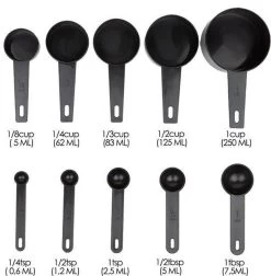 Een complete 10-delige set van maatbekers (cups) en maatlepels (teaspoons & tablespoons). Geschikt voor het afmeten van vele ingredienten tijdens het koken en bakken. De Amerikaanse maten zorgen ervoor dat de juiste hoeveelheid makkelijk af te lezen is.