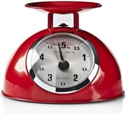 Deze retro keukenweegschaal met analoge aanduiding heeft een capaciteit tot vijf kilo. De afneembare RVS schaal is eenvoudig te reinigen.