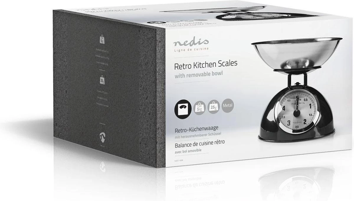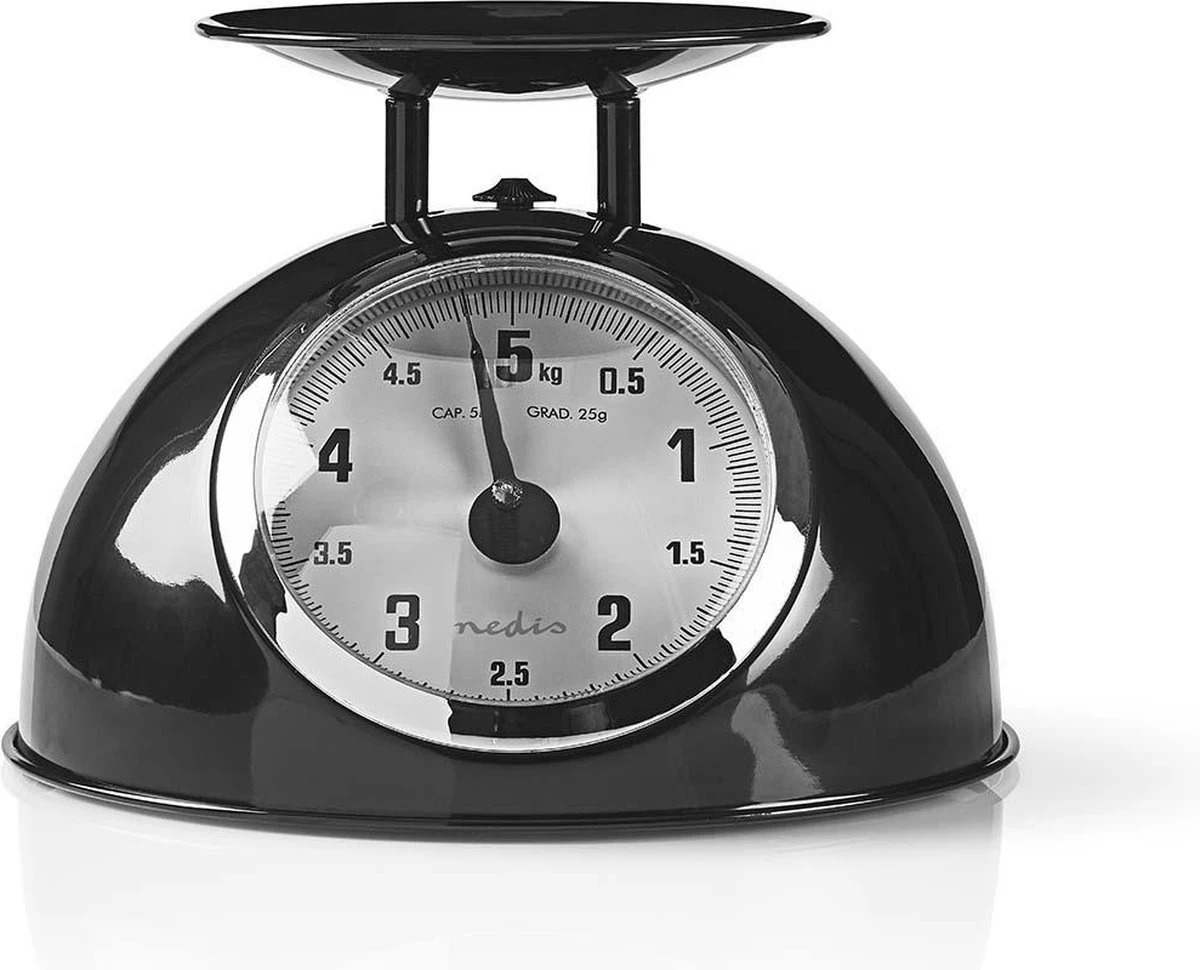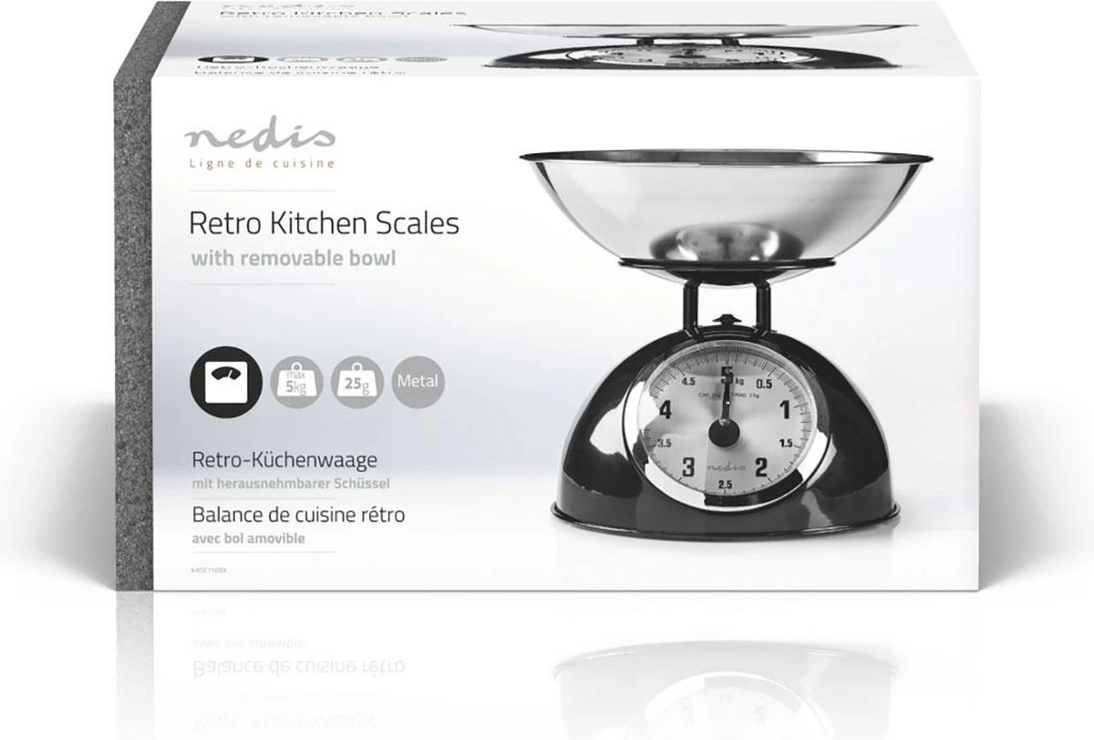 Analoge retro keukenweegschaal om ingrediënten tot maximaal 5 kilogram af te wegen. Wordt geleverd met een eenvoudig te reinigen, afneembare roestvrijstalen kom.
