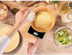 Met zijn aantrekkelijk, tijdloos moderne design en gemakkelijke bediening past de Soehnle keukenweegschaal Page Compact 100 perfect in de starterskeuken. Deze weegschaal is klein en compact, maar presteert daarom zeker niet minder. Hij weegt maximaal 5 kg en tot op 1 gram nauwkeurig. Met goed leesbaar lcd-display en praktische bijweegfunctie (tarra) – belangrijke functies bij het dagelijks gebruik. De Page Compact 100 is een bijzonder platte compacte weegschaal die zeer plaatsbesparend opgeborgen kan worden. De weegschaal gaat automatisch uit. Dat bespaart veel energie. De meegeleverde batterijen gaan zelfs bij tweemaal daags gebruik wel twee jaar mee. De batterijen zitten veilig in de batterijbehuizing dat stevig vastgeschroefd kan worden. Zo blijven ze buiten bereik van kinderhandjes.