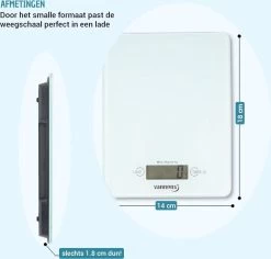Je kunt deze weegschaal overal kwijt, de afmetingen zijn 14 bij 18 centimeter en de dikte is slechts 1,8 centimeter. Zo kun je de weegschaal makkelijk in een lade of kastje leggen zonder dat hij teveel plek in beslag neemt.