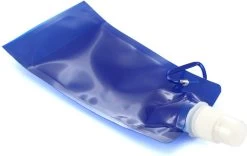 Waterzak blauw 400 ml opvouwbaar met haak. Handige waterfles van opvouwbaar en oprolbaar plastic. Met een haakje zodat u deze overal aan kunt hangen. De waterfles wordt geleverd met een drinkmondje erop en is hervulbaar. Inhoud: Ongeveer 400ml. Materiaal: Kunststof. Kleur: Blauw. Outdoor festival gadget benodigdheden.